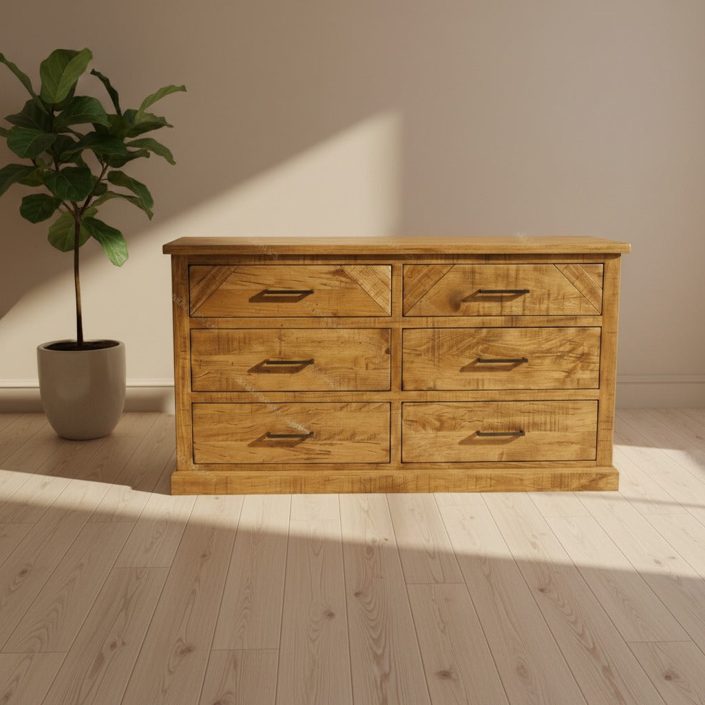 Crafted entirely from solid wormy maple by seasoned Mennonite woodworkers, the Cross Creek dresser demonstrates refined joinery and sustainable material sourcing. Its natural wood character—visible grain patterns and authentic hand-finishing—speaks to meticulous construction standards. A bedroom storage solution engineered for lasting performance, this piece combines functional reliability with the visual integrity of traditional craftsmanship.